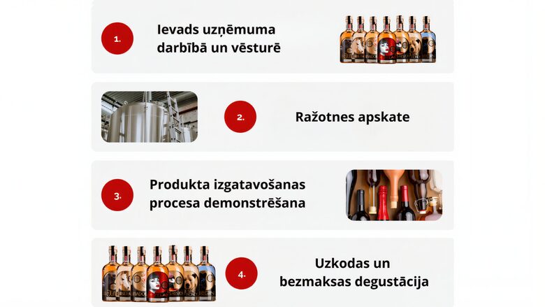 Atbrauciet ciemos, degustējiet dažādus dzērienus un iepazīstiet mūsu stāstu. Alkahola rūpnīcā pieejams veikals ar plašāko dzērienu klāstu un draudzīgākajām cenām. Darba dienu vakaros, brīvdienās, un svētku dienās papildus dzērienu degustācijai piedāvājam arī ekskursiju pa mūsu alkohola rūpnīcu. Standarta degustācijas cenā iekļauti 9 dažādi dzērieni. Esam elastīgi - ja vēlaties plašāku vai tieši pretēji, tev ir maz laika-vienosimies savlaicīgi!
